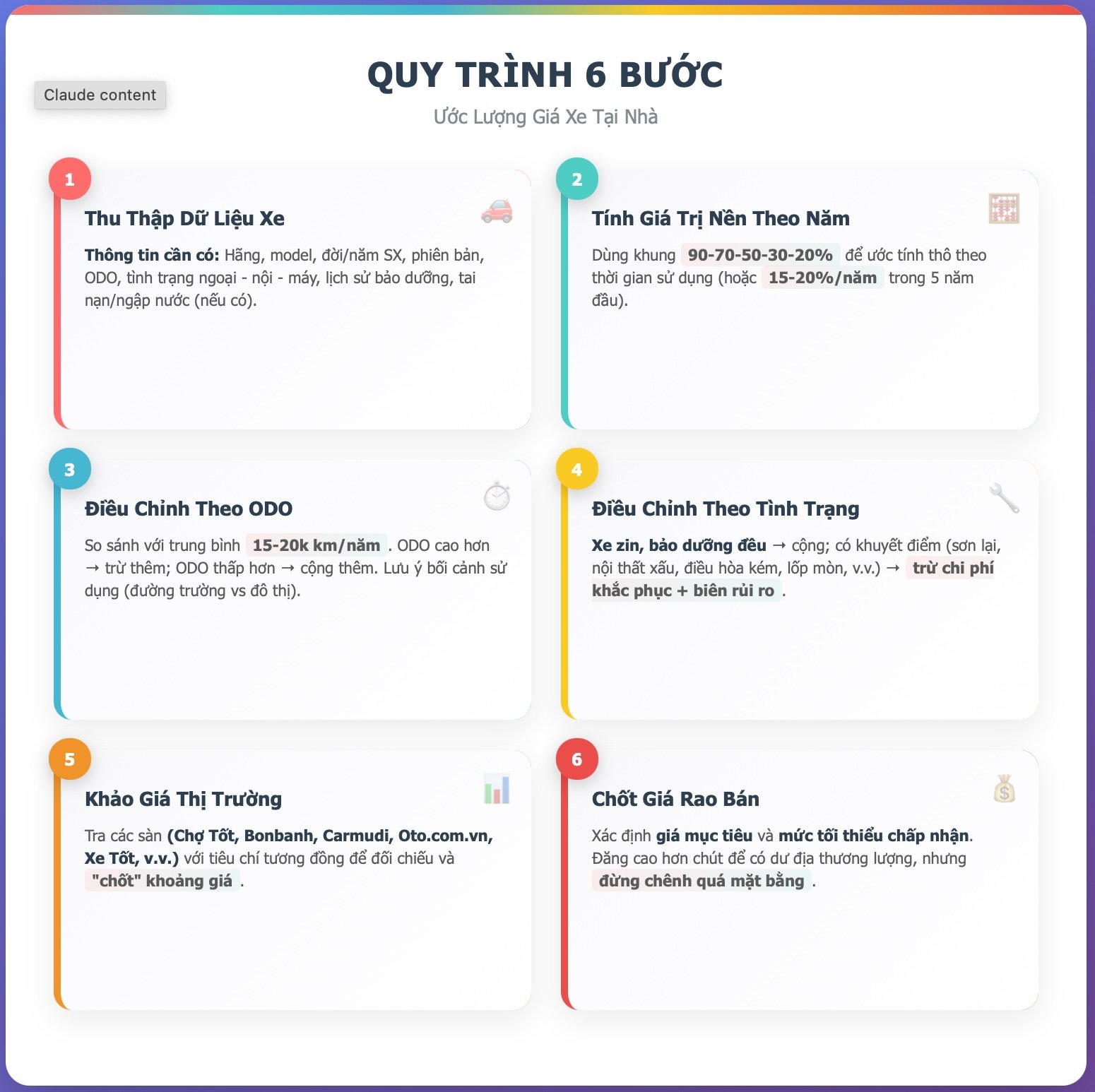 Cách làm nhanh: (1) ước giá trị nền theo tuổi xe; (2) chỉnh theo ODO; (3) cộng/trừ theo tình trạng; (4) so lại giá thị trường để chốt khoảng hợp lý.